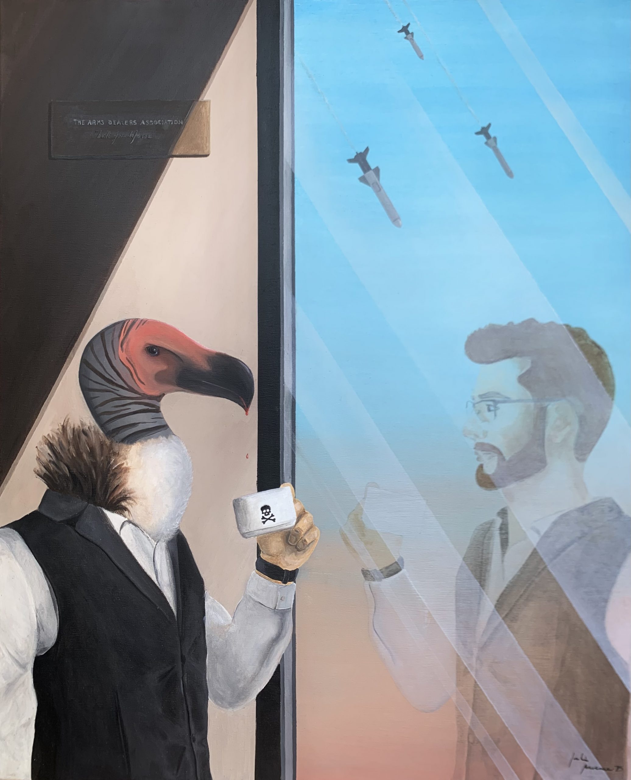 La figura antropomórfica, de ave carroñera, sostiene una taza marcada con el símbolo del veneno, como si la violencia fuese un producto cotidiano, digerible, normalizado. Frente a él, un reflejo humano —casi etéreo— su apariencia social, un contraste que revela la crudeza que muchos prefieren ignorar.